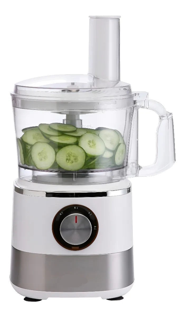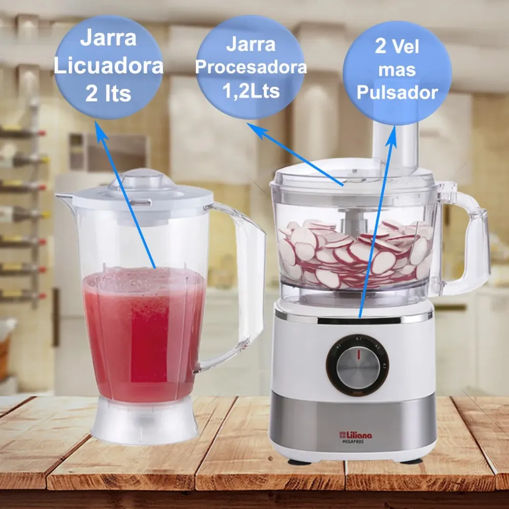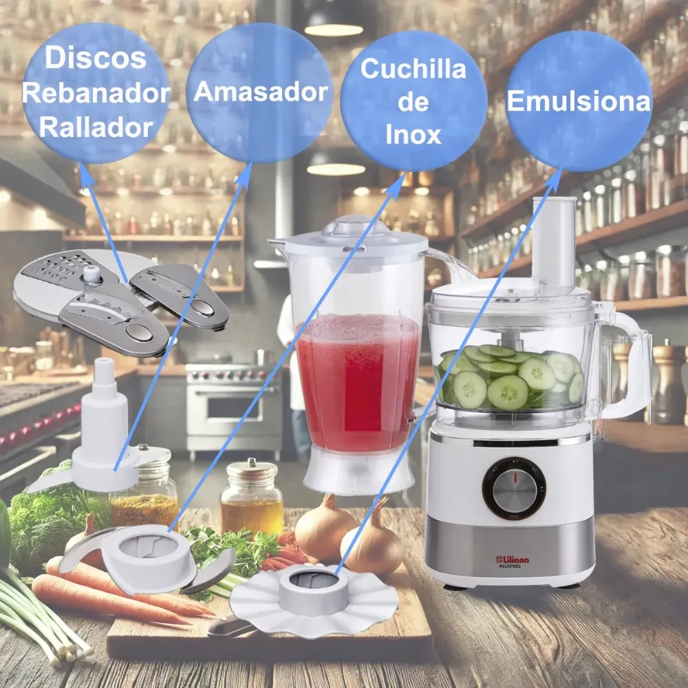 Una multiprocesadora diseñada para facilitar todas las tareas en la cocina: picar, rallar, rebanar, amasar, emulsionar, licuar y preparar mezclas con un solo equipo. Perfecta para quienes cocinan seguido, buscan practicidad y quieren ahorrar tiempo — desde verduras o carnes, hasta masas, salsas o licuados.