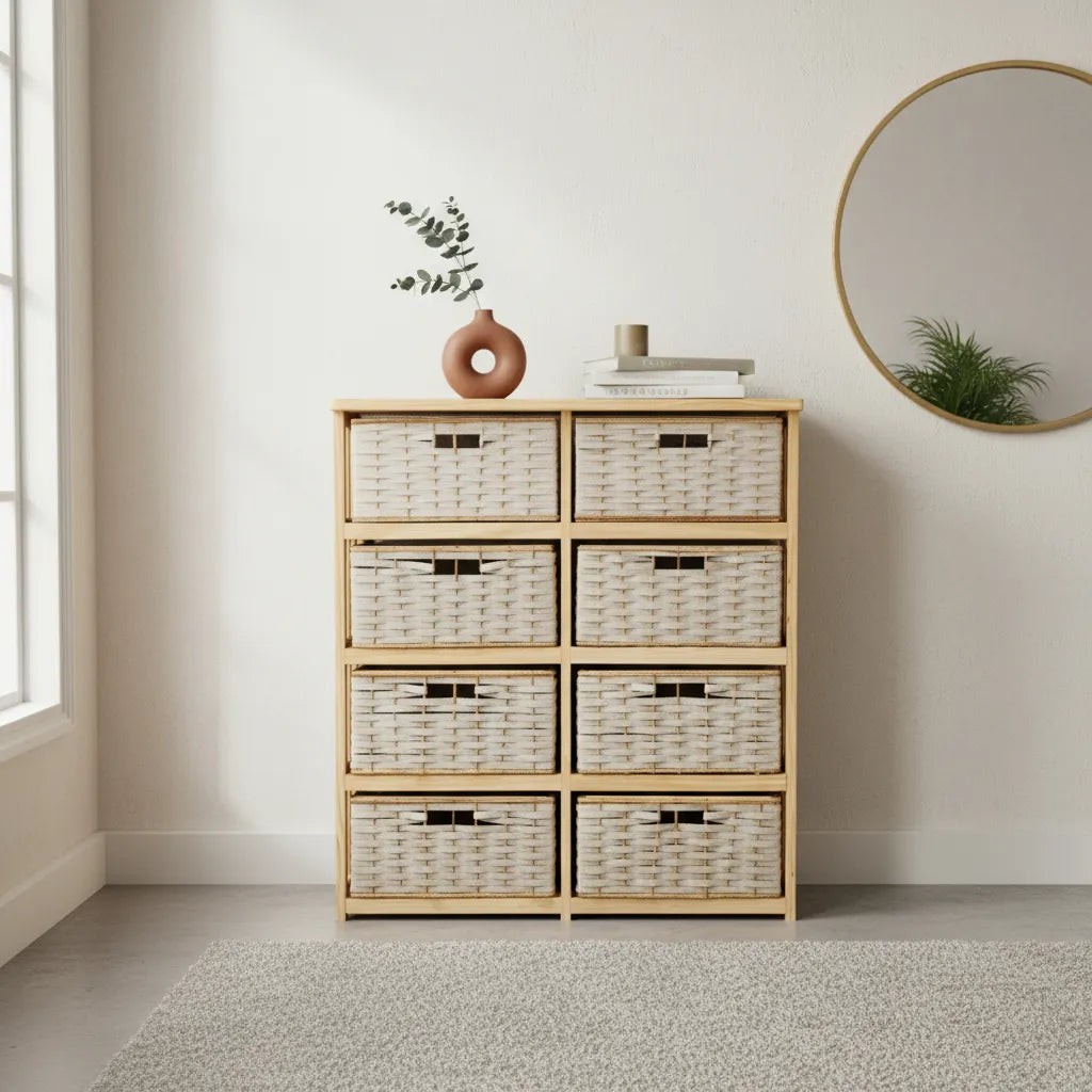 Este organizador canastero es una solución ideal para mantener el orden y la armonía en distintos ambientes del hogar, como el dormitorio, el baño, la sala o el placard. Gracias a sus 8 cajones elaborados en mimbre con zuncho plástico, podés guardar ropa, juguetes, toallas, ropa interior o cualquier otra cosa de forma accesible y estética.
