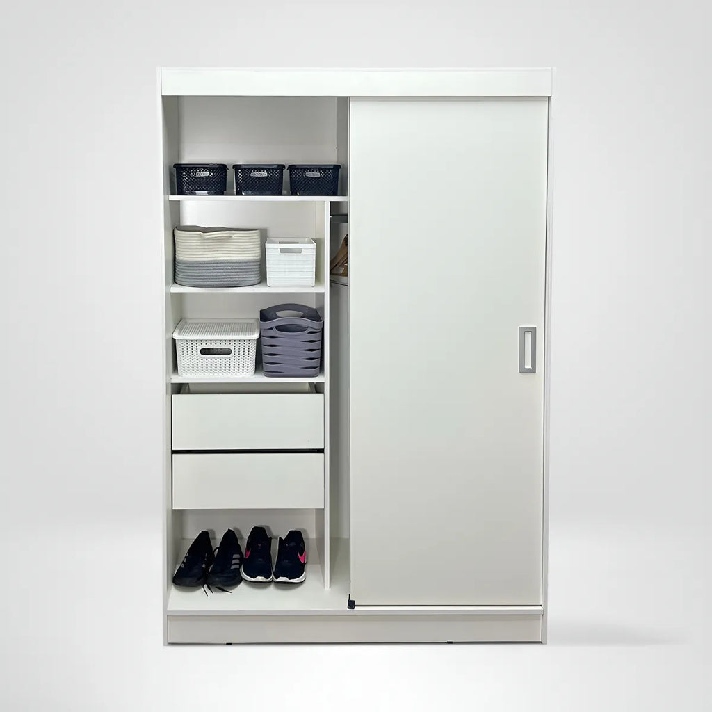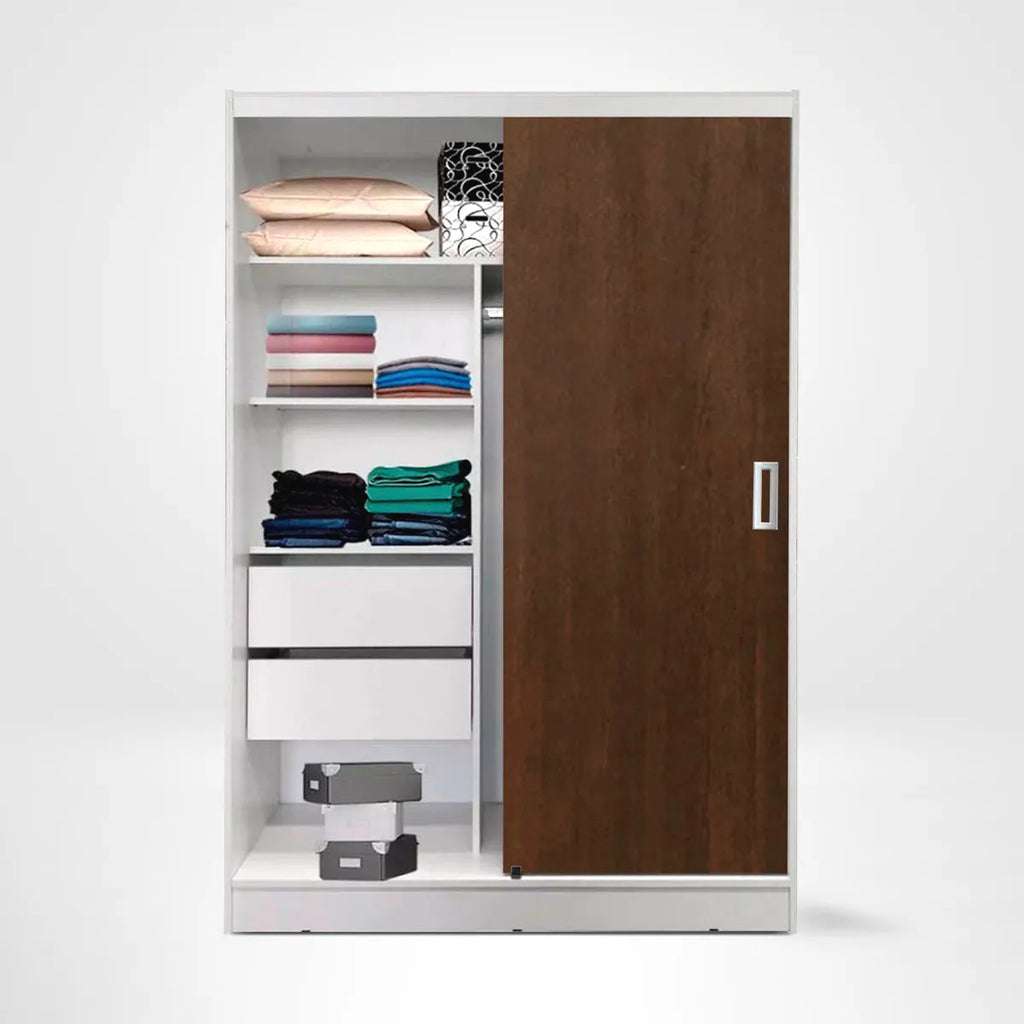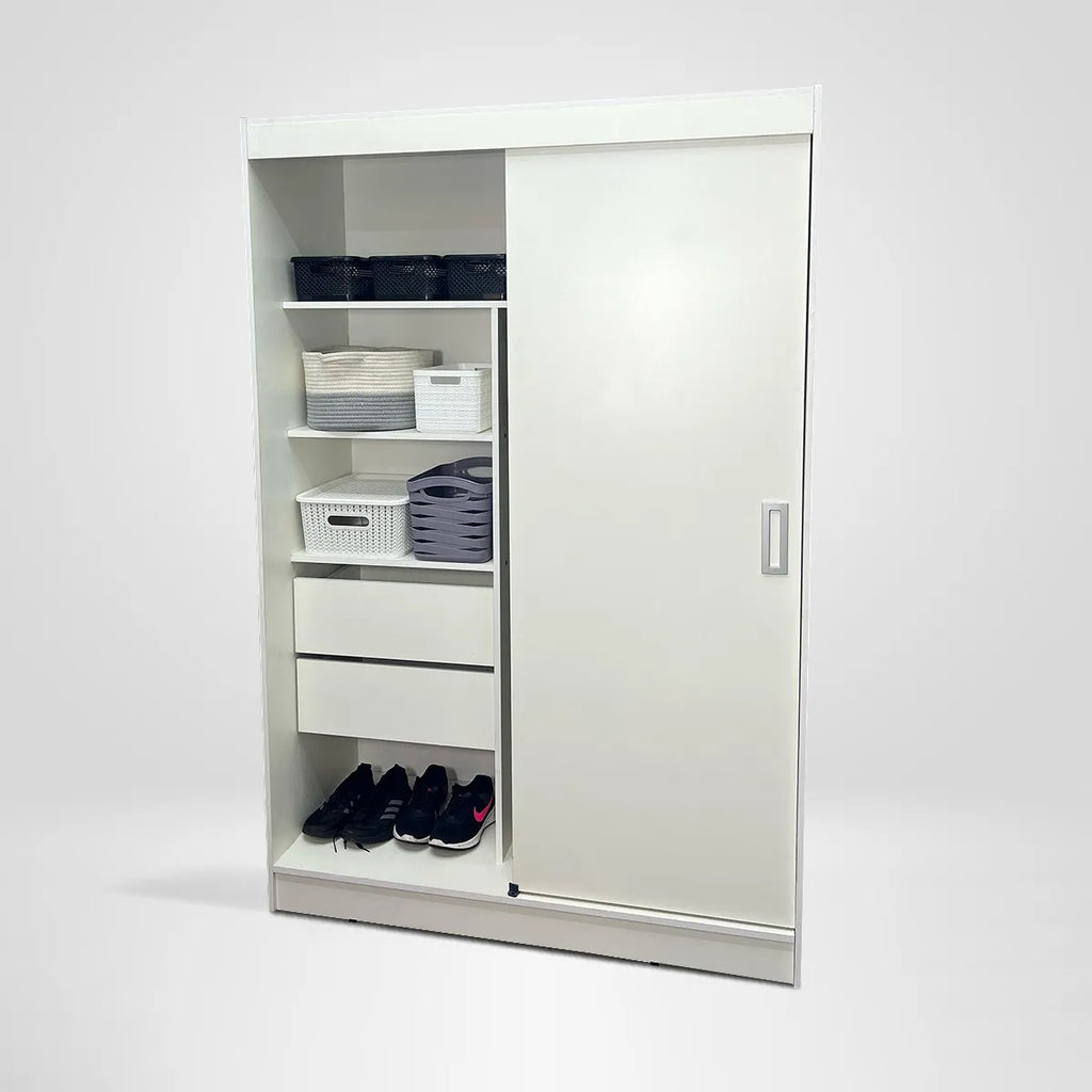 Organizá tu ropa con estilo y practicidad: placard con 2 puertas corredizas, cajones y estantes, en diseño moderno y acabado blanco.