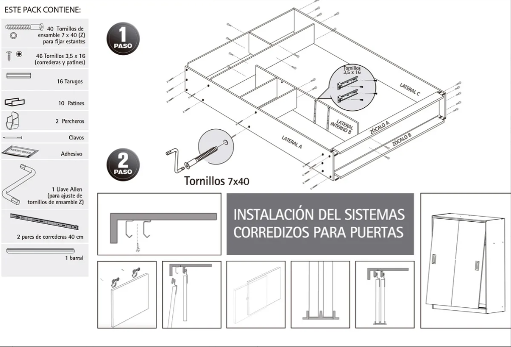 Armá el placard siguiendo el manual: separar las piezas, tornillos y paneles antes de empezar.