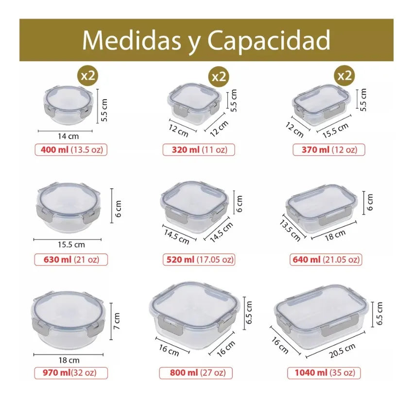 Ideal para conservar alimentos, preparar porciones, guardar sobras y mantener orden en cocina/pantry.