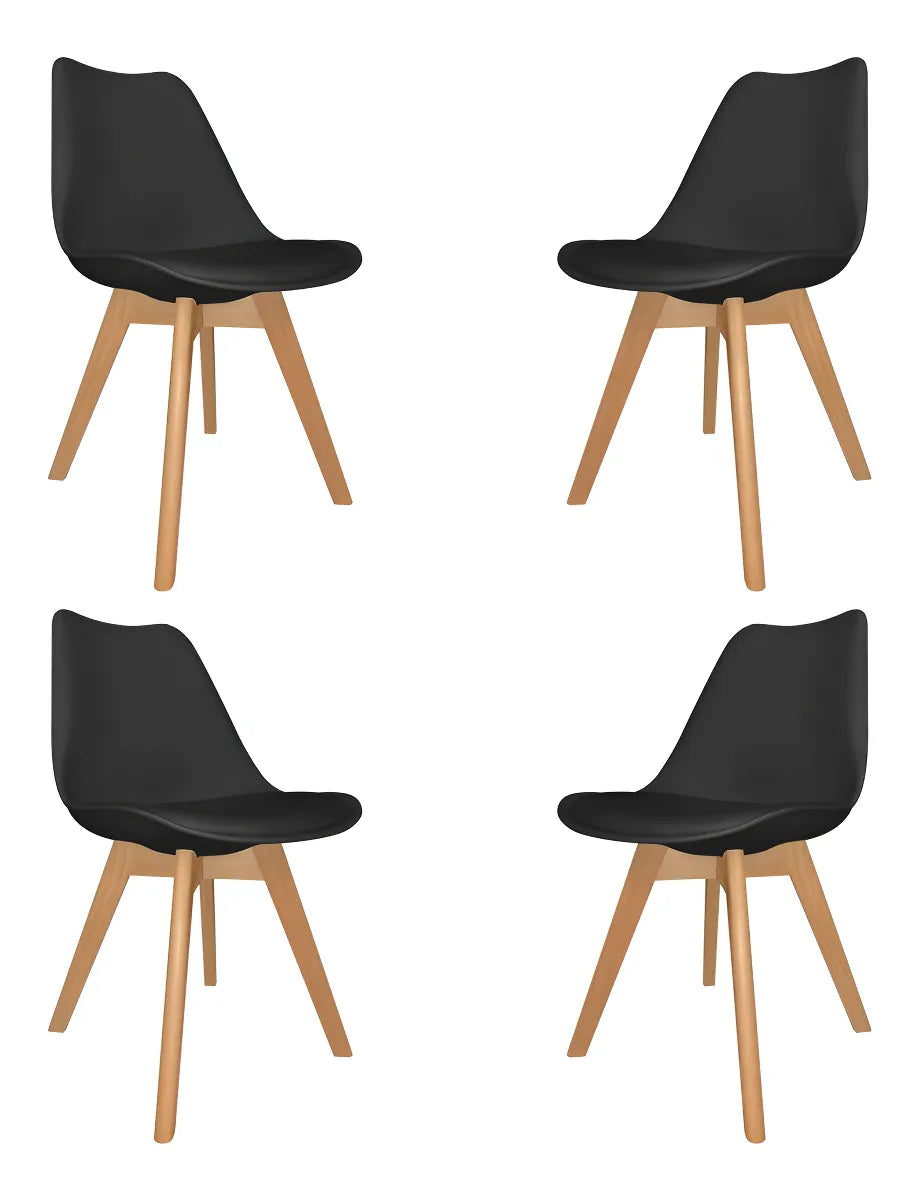 Cuatro sillas modernas y versátiles, con asiento acolchonado y diseño nórdico — ideales para comedor, cocina o espacios interiores/exteriores.