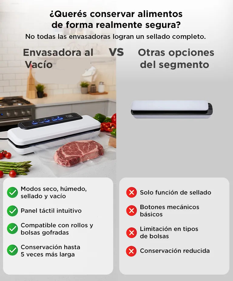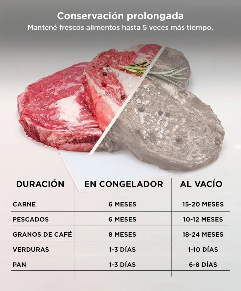 Al eliminar el aire, los alimentos pueden durar hasta 5 veces más en comparación con métodos tradicionales.